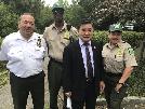 (明報29日訊)紐約市議員顧雅明(右二)週一宣佈,將僱用三名全職保安人員在法拉盛的凱辛納走廊公園和凱辛納公園進行巡邏。