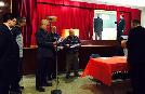 (紐約14日訊)為慶祝農曆春節的來臨,紐約地區多位書法家及藝術家近日來在社區舉辦多場免費贈送春聯活動。書法家周唐軒(右二)12日聯同藝術家兆鍾芬(左一)等人在法拉盛台灣會館書寫春聯及吉祥話,贈送给社區民眾,受到熱烈歡迎。周唐軒也特別書寫「招財進寶」、「春」、「福」等春帖,讓民眾帶回家討個吉利。