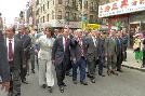 (明報30日訊)聯邦交通部長趙小蘭日前偕父親趙鍚成博士到華埠訪問,沿街受到僑胞夾道歡迎,群眾熱烈鼓掌目睹「華人之光」。國殤節前夕,趙小蘭與趙錫成一行先至中華公所拜會,再沿著勿街一路走到且林士果的華裔軍人忠烈坊獻花,再到中華總商會為「鐵路華工歷史圖片展」的開幕儀式剪綵,晚上與僑界餐敘。