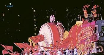 有大鼓、紅燈籠及五星旗,一望便知是代表中國的綵船,亦是第一艘進場綵船。(圖:香港明報)