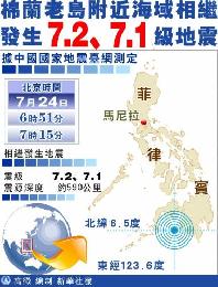 (菲律賓)據中國地震台網測定,北京時間2010年7月24日6時51分、7時15分,菲律賓南部棉蘭老島附近海域(北緯6.5度,東經123.6度)相繼發生7.2、7.1級地震,震源深度約590公里。