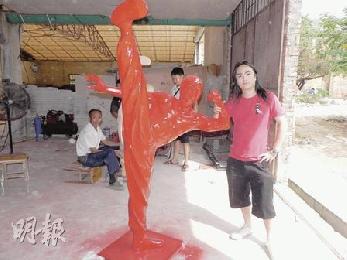 佛山市50尊李小龍陶瓷雕塑將於8月送往世博展出,但腳踢建築物的造型被指“太霸道”。創作者舒勇(圖右)表示,雕像只是寓意中國功夫走向世界。(圖:香港明報)