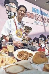 季軍參賽者劉寶蓮手捧8碟菜色,仍能笑臉迎人,她的工作心得除了是傳菜快,還有以心對待顧客。(圖:香港明報)