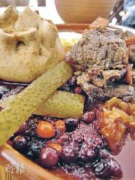 筆者在這裡品嘗招牌的中世紀富人餐:肉盤!以陶盤盛著厚切牛肉、火腿和大肉腸,還有一個皮厚厚卻炸得脆的包子——裡面,當然又是肉!伴上乳酪,分量之大有點令人咋舌,吃完足以增磅!吃時最好一邊把伴碟的超酸黃瓜和莓子一同吃,以紓緩厚膩的感覺。