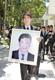 靈堂佈置以白色為主,靈柩上鋪滿白花,鄭嘉穎送來的花牌就放在當眼位置,寫著:“敬愛的戴老師,祝願一路好走,往生淨土,嘉穎敬輓”。