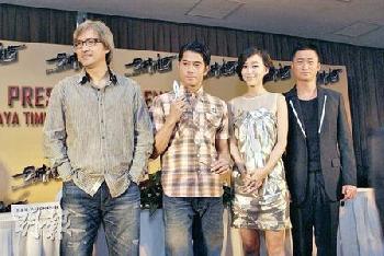 導演陳木勝、郭富城、張靜初及吳京現身吉隆坡為新片造勢。(圖︰香港明報)