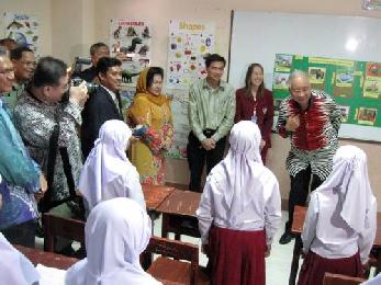(泰國)馬來西亞首相拿督斯里納吉週三訪問泰南陶公府阿達比雅回教中學,臨別時一時興起,走進了英文班當起“英語老師”,教孩子們唸單字。