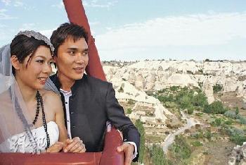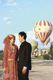 穿民族服以熱氣球和奇石作背景,是土耳其特有的婚照構圖。(圖:香港明報)