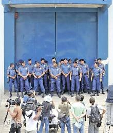 停泊肇事旅巴的貨倉外,8月30日由大批警員駐守,香港傳媒未能入內採訪。(圖:香港明報)