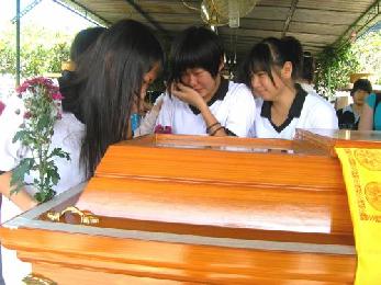 出席凱旋葬禮的同學們穿著凱旋喜愛的紫色“班衣”及白色T恤,心情沉重之余,表現對死者的友愛情深,寄了無限的懷念。同學們還合唱2首歌,即《朋友》和《友誼萬歲》,送凱旋走完人生最後一程。