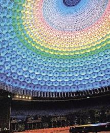 無錫‧梵宮聖壇是今年3月世界佛教論壇的會場,頂上的LED燈經常轉換,耀眼非常。(圖:香港明報)