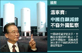 (丹麥)中國總理溫家寶表示,中國在自願減排行動上,不容許外國監察,回應美國提出要求中國的減排成果應接受監察。