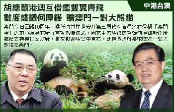 (澳門)澳門今日(週日,12月20日)回歸10週年,候任特首崔世安及第3屆政府官員將在俗稱“澳門蛋”的東亞運場館舉行宣誓就職儀式。國家主席胡錦濤週六(12月19日)在多個場合均高度評價週日卸任的澳門特首何厚鏵,並呼吁何厚鏵離任後繼續支持崔世安政府。胡錦濤更在歡迎晚宴中宣佈,應特區政府要求贈送一對大熊貓給澳門。
