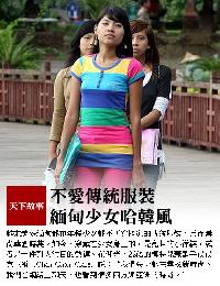 “韓國服裝看起來是那麼地出色、富有時尚感。”晨晨說最時尚的韓流服裝,如小短裙配夾克衫、短褲或者是內搭褲,在緬甸都很容易找到,也可以看到不少人作這樣的穿著打扮。