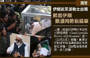 (伊朗)上週六逝世的伊朗改革派教士蒙塔澤里(Grand Ayatollah Hossein Ali Montazeri)週一(12月21日)舉殯,數萬名反對派支持者湧到其出生地參加喪禮,並與警察爆發衝突,多人被捕。