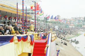 (柬埔寨)柬埔寨一年一度傳統盛大節日──送水節於11月20日拉開帷幕,西哈莫尼國王御臨四臂灣皇室觀禮台,為送水節主持開幕儀式。
