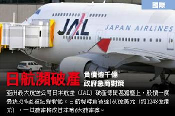 (日本)亞洲最大航空公司日本航空(JAL)破產傳聞甚囂塵上,股票週二(12月29日)在日股今年最後一個交易日被大舉拋售,一度暴跌32%至破紀錄新低。日航現時負債達160億美元(約1248億港元),一旦破產將成日本第6大破產案。日本內閣週二召開緊急會議商討拯救日航,國土交通大臣強調,政府會盡力協助日航重組,破產“並非唯一選擇”。