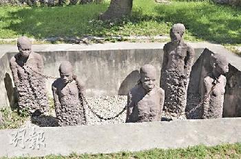 19世紀石頭城曾有黑奴販賣,石雕反映當時的奴隸市場情況。(圖:香港明報)
