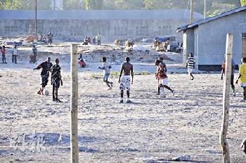 坦桑尼亞足球水準雖然一般,世界排名仍較香港高。在達累斯薩拉姆魚市場外,小孩都會在街上踢球。(圖:香港明報)
