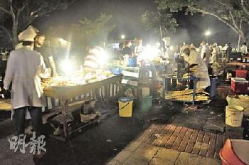 桑給巴爾佛羅達尼公園晚上成了熟食小販擺賣的場地,也是遊客品嘗地方小吃的夜市。(圖:香港明報)