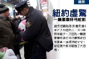 (美國)飽受恐襲陰影折磨長達8年之久的紐約人,2010年新年前夕,又因為一輛被遺棄在紐約時代廣場前的休旅車,搞得神經兮兮,給這個大都市製造了大恐慌。
