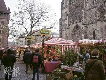 紐倫堡的聖誕市集,背景襯托帶有歐式風情的建築物。(圖:香港明報)