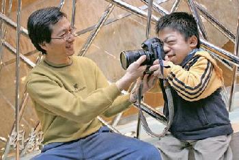17歲的歷生(右)興趣與時下的年輕人相差不遠,上網和攝影是他的嗜好。他一看到攝影師的專業相機後躍躍欲試,他對相機的功能十分熟悉,絕不是“得個樣”。雖然未能獨力抬起相機,但在爸爸的協助下,他總算一嘗所願,拍了幾張照片。(圖:香港明報)
