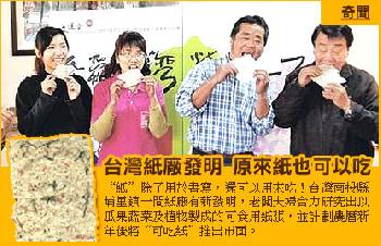 (台灣)“紙”除了用於書寫,還可以用來吃!台灣南投縣埔里鎮一間紙廠有新發明,老闆夫婦合力研究出以瓜果蔬菜及植物製成的可食用紙張,並計劃農曆新年後完成“紙愛台灣‧榮耀100(百種可吃的紙)”的目標,將“可吃紙”推出市面。