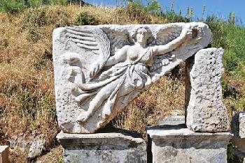 Nike神聖一“剔”--許多人都知道Nike的名字源自勝利女神,以弗所古蹟內便有勝利女神的壁畫,她腳前飄揚的,便是有名的剔標誌了。(圖:香港明報)