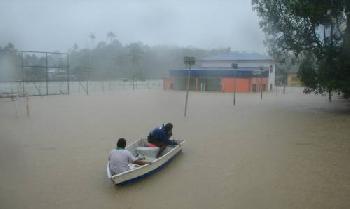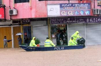 昔加末部份低洼地區已經泛濫成災,許多道路無法通行,有關當局必須出動小艇接載受影響人士。(馬來西亞星洲日報)
