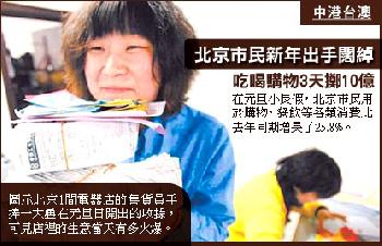 (中國)北京市民出手有多闊綽?在元旦小長假,北京市民3天就豪擲21.03億元人民幣(約10.5億馬幣)用於購物、餐飲等各類消費,比去年同期增長了25.8%。北京商業委員會的數據顯示,北京市民在新年期間主要以購物消費為樂。