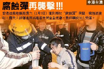 (香港)遊客必到景點油麻地廟街,週六(1月9日)晚上遭到兩枚“腐蝕彈”突襲,“砰、砰”兩聲後,兩瓶雙魚牌通渠水著地爆開,腐蝕液激射,露天大排檔逾百名遊客市民倉皇走避,最終釀成30人受傷。事發後,商戶立即守住部份大廈出入口,警方到場搜查,拘捕一名匿藏案發大廈天台外簷篷的男子,正調查疑人是否導致連同週六在內的共5宗136人受傷的腐蝕彈狂徒。