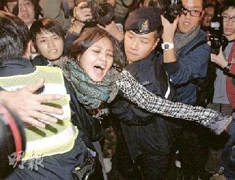 泛民在元旦日舉行“還我普選權”大遊行,示威者當日衝破警方鐵馬防線,圖中顯示陳巧文(中)當日和警員糾纏的情。(圖:香港明報)