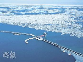 隆冬時候,紋別的海面泛起白色流冰。(圖:香港明報)