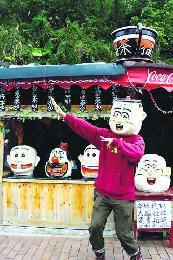 勝興村口的小吃店,擺了許多漫畫人物公仔頭給遊人免費拍照。(圖:香港明報)