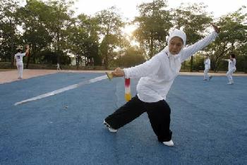 戴著頭巾的她們在練功的人群中特別突出,只見她們有模有樣地練功耍劍,絲毫不遜色於其他華裔成員。