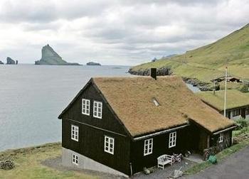 外牆塗瀝青、屋頂長草的房子,加上奇峰異石,是法羅群島的寫照。(圖:香港明報)
