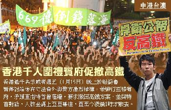 (香港)立法會財務委員會審議669億元的廣深港高鐵撥款申請已超過16小時,今日(週六,1月16日)繼續審議。逾千名示威者週五(1月15日)晚上於財委會暫停討論後在立法會外與警方激烈推撞,並遊行至禮賓府,矛頭直指特首曾蔭權,要求撤回高鐵方案,並與特首對話,人群坐滿上亞厘畢道,直至今凌晨1時才散去。警方出動大量警力,封鎖整條上亞厘畢道,嚴防示威者衝入。