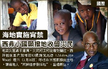 (海地)地震災區滿目瘡痍,災民何去何從備受關注。西非國家塞內加爾的83歲總統瓦德(Abdoulaye Wade)週六(1月16日)呼吁非洲國家撥出土地,讓海地人“回歸祖宗發祥地”,重過新生。