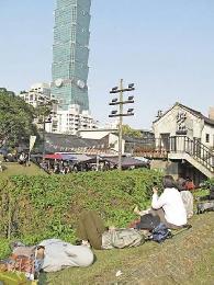 我們有樣學樣,跟他們一樣坐在眷村斜坡頂,眼前聳立著台灣的標誌台北101大樓,台灣人怎麼想,我不知道,但作為過客,這樣橫跨數十載的新舊與高矮對比,實在有著耐人尋味的魅力。