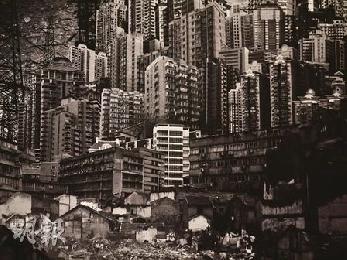 近看才發現筆觸其實是現代的水泥建築圖片。(圖:香港明報)