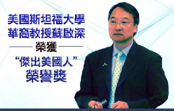 (美國)美國斯坦福大學亞裔肝臟中心主任蘇啟深教授週四(1月21日)在舊金山接受美國公民及移民服務局頒發的“傑出美國人”榮譽獎。他是繼前勞工部長趙小蘭及父親趙錫城、美國陸軍首位華裔將軍傅履仁、美國退伍軍人協會副指揮官黃方(音譯)之後的第5位華裔獲獎者。