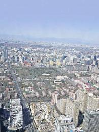 從北京國貿大酒店看到的風景,既有中央電視台,也有紫禁城(留心看啊,左上角那些金黃屋頂就是了)。(圖:香港明報)