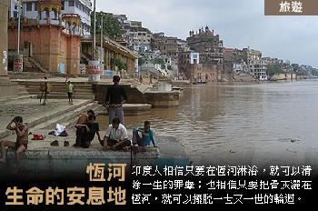 她也是興都教最神聖的地方之一。她的神聖是被恆河(Ganges)襯托出來的;這條源之喜瑪拉雅的母親河,每年不知承載了多少個人的罪孽,也不知背負了多少個脫離輪迴的願望;隨著河流的漂動,最終把它們全都葬送在汪洋大海裡;印度人相信只要在恆河淋浴,就可以清除一生的罪孽;也相信只要把焚化後的骨灰灑在恆河裡,就可以擺脫一世又一世的輪迴。