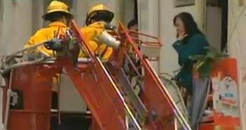 消防員其後升起雲梯,將被困樓宇內的一女一男居民救落地面。(香港明報)