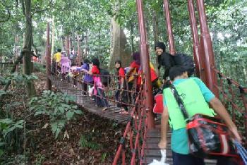 這批學生在進入森林度過兩天一夜生活營後,使用這座吊橋前往吉隆坡塔的正門入口側邊,以乘搭巴士離開。(圖:馬來西亞星洲日報)