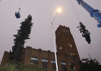 經過3個多小時鋸樹行動後,樹齡70年、高23.5米以及5噸重的“鬼樹”南洋杉終被移離瑪利諾修院學校,學校景觀已不一樣。(圖:香港明報)