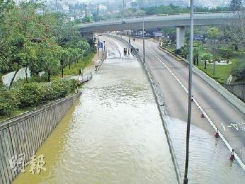 由於上址路段屬低窪地帶,泥水湧出淹浸往灣仔方向線道,形成水深近4呎小水塘,對面往香港仔方向快線亦被浸,駕駛者見狀紛紛煞車,場面混亂。