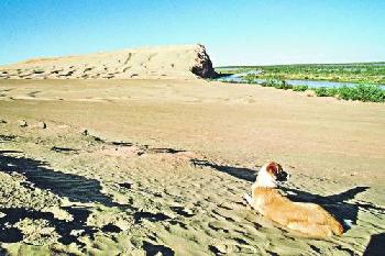 話說我們原先準備了5艘橡皮艇,結果只有2隻能用,最後決定5人下船漂流,我和一名維族翻譯從陸路北上,與他們會合。起錨前,我們用饢及黃豆投進和田河,先祭河神,保祐平安。只見河邊軟泥不斷剝落,河水滔滔,河面有時一望無際。當時我和母狗在岸邊送別隊友,只能誠心祝福。狗媽媽顯得心情沉重,坐在我身邊,不時翹首北望。