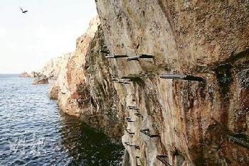• 三段壁從底下望上去的景致,可以見到鐵鋼,從前作海軍的攀爬之用。(圖:香港明報)